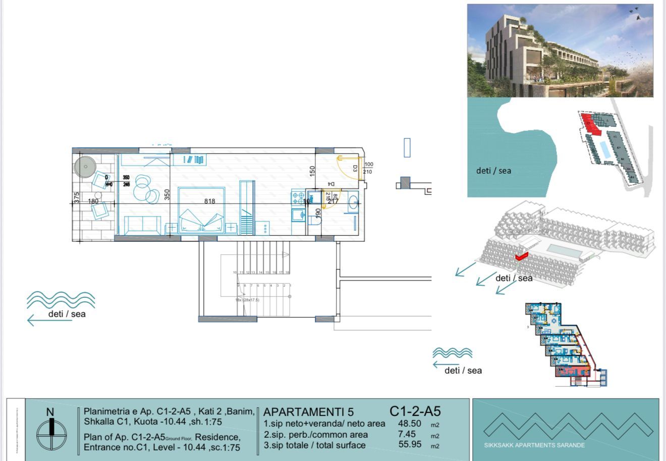A modern 1+1 apartment located on a newly built residence, with a total area of 55.95 m², including 48.50 m² of interior space.