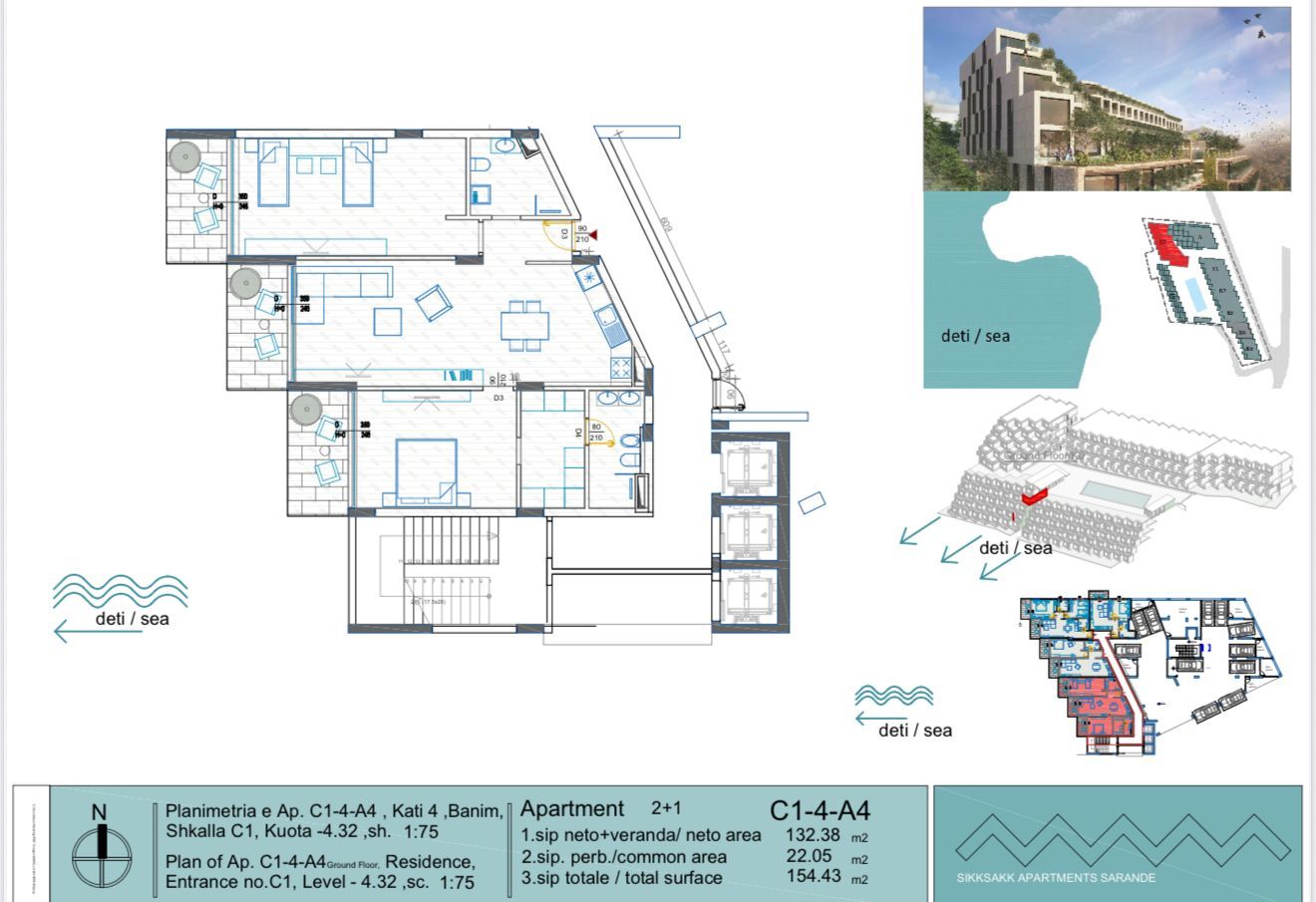 A modern 2+1+2 apartment located on a newly built residence, with a total area of 154.43 m², including 132.38 m² of interior space.