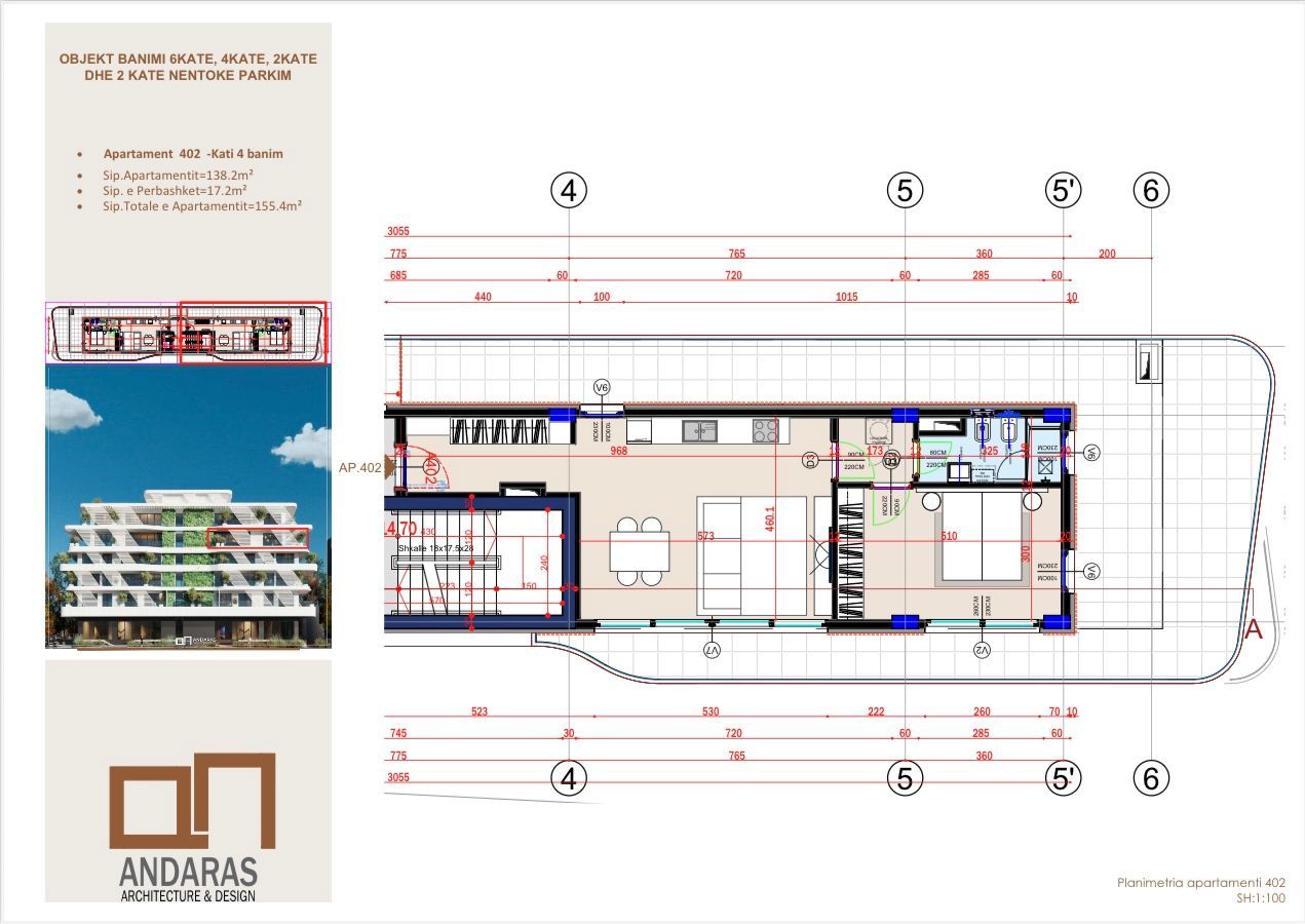 A modern 1+1 apartment located on the first floor of a newly built residence, with a total area of 155.4 m², including 138.2 m² of interior space.
